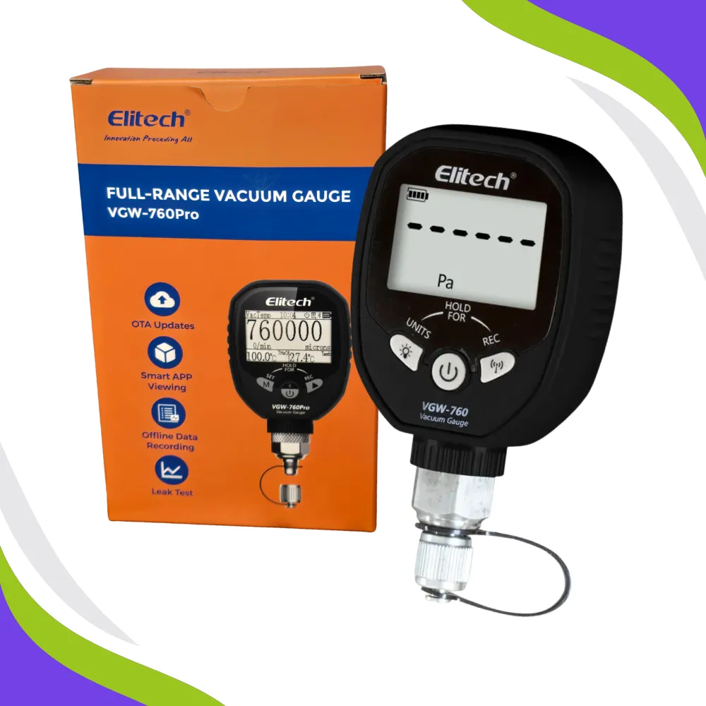 O Vacuômetro Digital Elitech VGW-760 PRO Bluetooth é a ferramenta ideal para quem busca precisão e segurança na evacuação de sistemas de ar-condicionado automotivo, refrigeração comercial e HVAC-R em geral. Com faixa completa de 1 a 760.000 mícrons, ele permite acompanhar em tempo real a profundidade do vácuo e identificar problemas como umidade residual e microvazamentos, garantindo serviços mais confiáveis para o seu cliente.